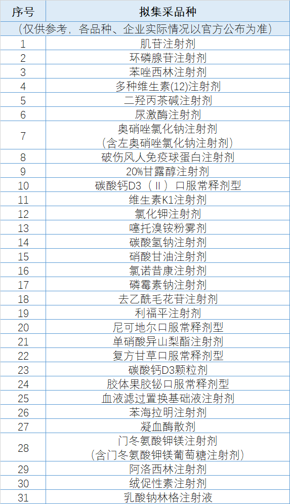 本月初,一份《关于邀请参加药品联盟集中带量采购的函》在业内流传,河南拟牵头组成省际联盟,对肌苷注射剂、环磷腺苷注射剂等31个品种(完整拟集采名单见文末附3)开展集中带量采购工作,按该文件计划,有参与意向的省需在5月6日前函复河南医保局,预计后续正式文件将在近期公布。