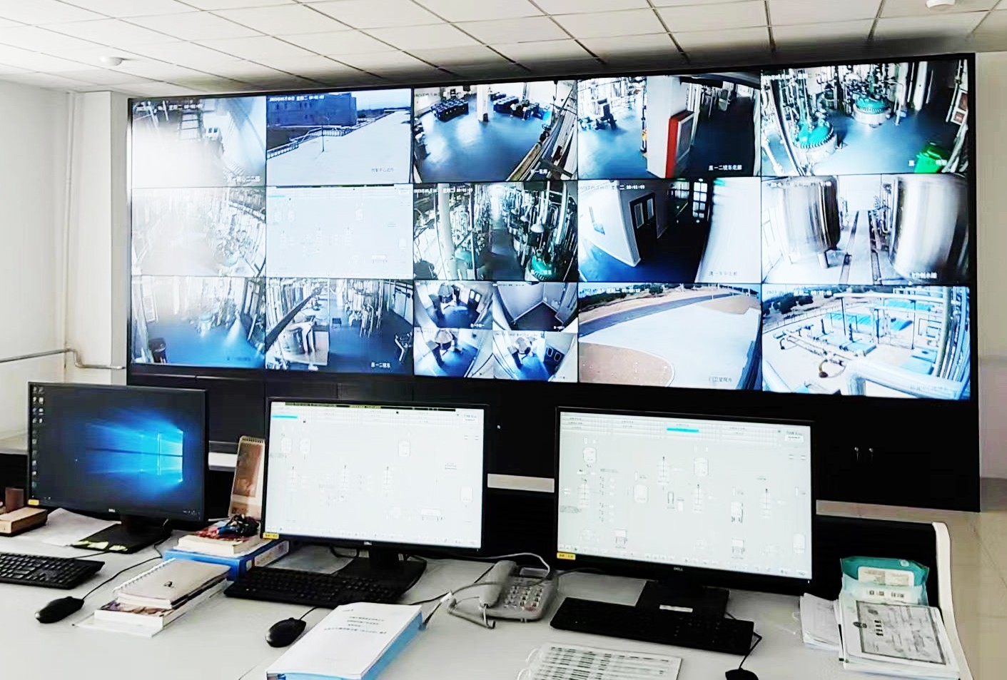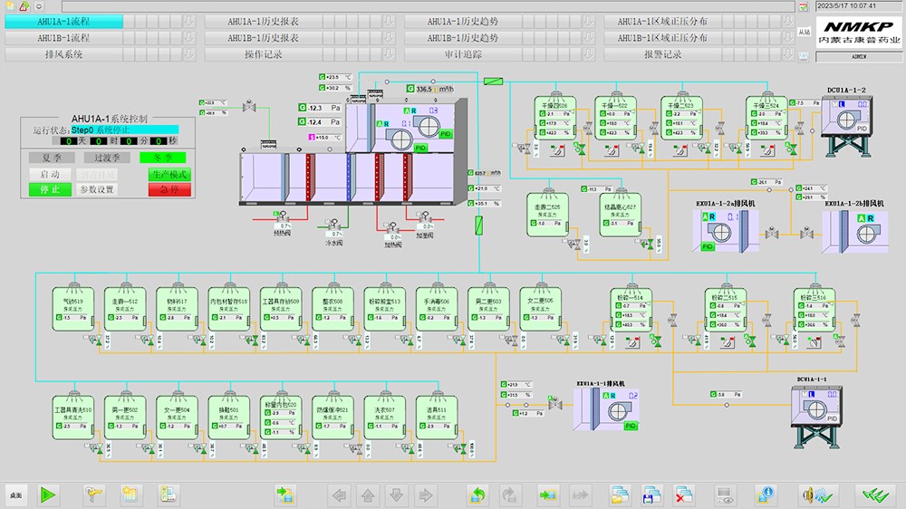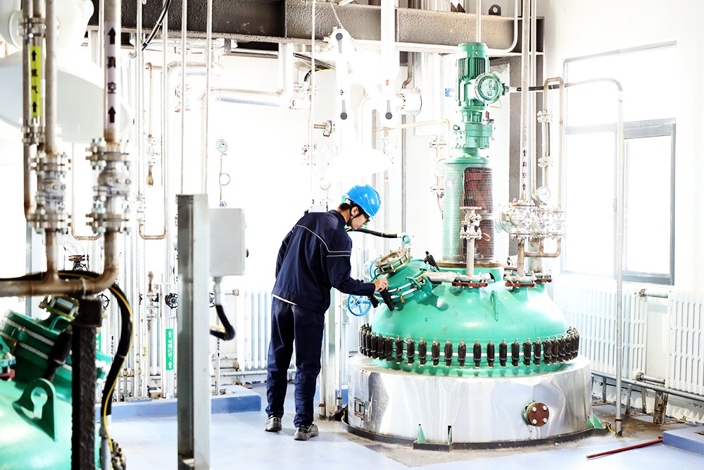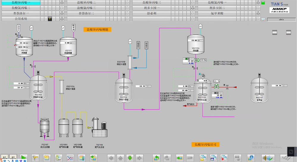 DCS自动化控制系统:原料一车间与二车间有一整套DCS系统,生产反应过程中的重要参数(如温度、压力等)通过仪表远传至集散控制系统上进行显示、控制。通过与设定值进行比较,来实现相应气动阀的开启/关闭、控制或开度调节,以保证生产参数在要求的范围内。当检测到的温度超过报警设定值时,人机界面上有相应报警提示。