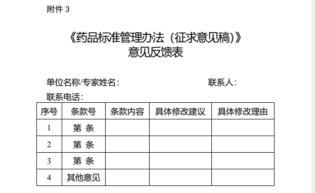 3.《药品标准管理办法(征求意见稿)》意见反馈表